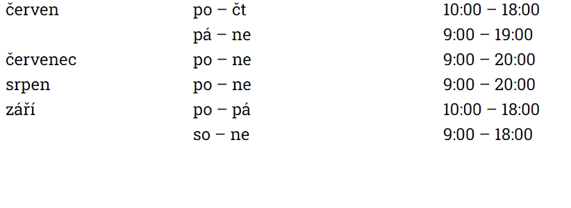 Стоимость: взрослый — 100 крон, дети от 100 см до 15 лет, студенты до 26 лет, пенсионеры от 62 лет — 50 крон, дети до 1 года — бесплатно.
